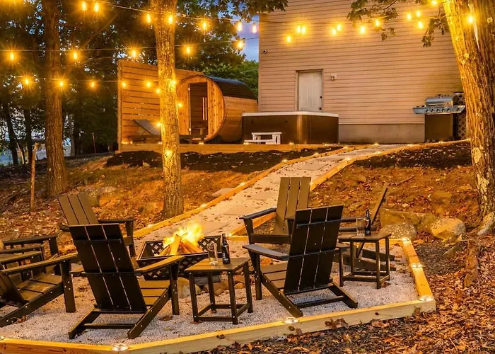 Localizada 4.7 km do Pocono Candle, a pousada Retreat Hottub Firepit Sauna Gamerm Pool Playroom East Stroudsburg dispõe de pátio com vistas para o lago.